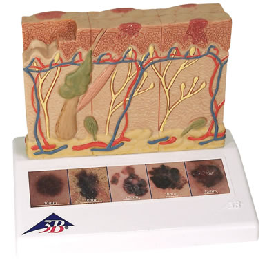 這款3B Scientific®病變模型放大8倍展示了6個不同階段的黑色皮膚腫瘤的前面和側面:•健康的皮膚•黑色細胞位于表皮的表面•黑色細胞充滿表皮,稍微入侵乳突層•黑色細胞充滿乳突層•黑色細胞入侵網狀組織層•黑色細胞已達到皮下脂肪纖維,其隨體細胞位于靜脈附近